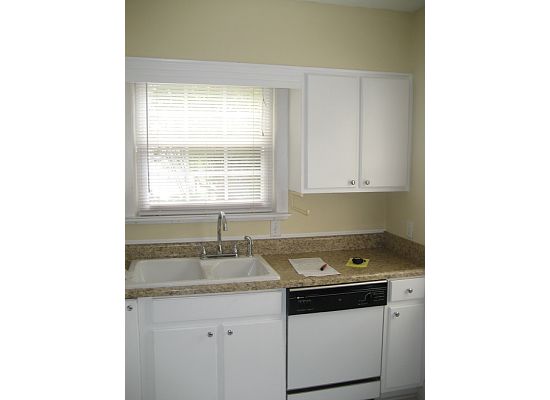 Our counters and cabinets had decent bone structure so we decided to work with what we had in that department. We removed all the cabinet doors and sanded the heck out of them. Then primed and repainted them. I decided during this phase to leave the doors off and go with an open cabinet concept. I think it makes the kitchen look bigger.