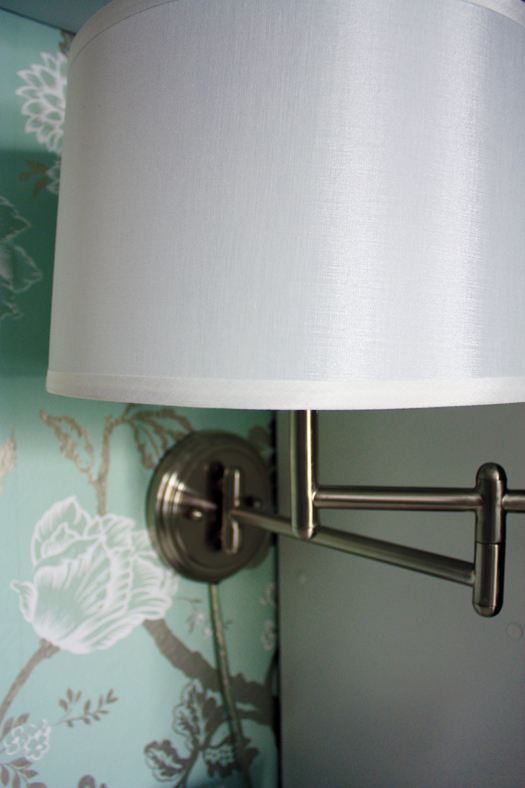 We installed an outlet inside the closet to allow us to plug in our computer and other pc related hardware, along with a swing arm lamp we installed above for task lighting: