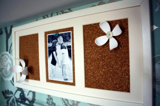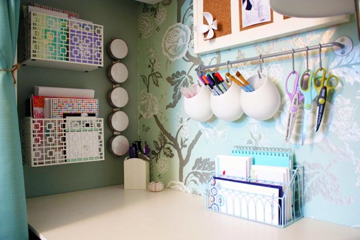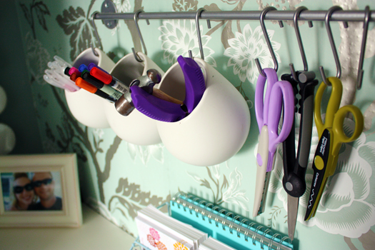 On the back wall, I placed cork inside an old frame to act as a memo board, and we installed a rail with hooks and cups for pens, markers, scissors and other crafting tools: