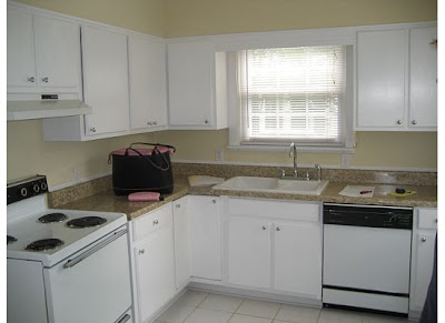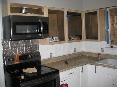 Our counters and cabinets had decent bone structure so we decided to work with what we had in that department. We removed all the cabinet doors and sanded the heck out of them. Then primed and repainted them. I decided during this phase to leave the doors off and go with an open cabinet concept. I think it makes the kitchen look bigger.