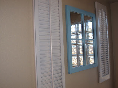 >These colors are so cute, clean, and cottage! I love the mirrored window and the chandelier so much I don't think you even need the shutters. Very cute project!