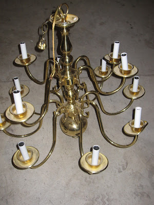 So a couple months ago I had a VERY good day at goodwill. The only time I like to go to goodwill is when I’m in Mesa, and when it’s 50% off Saturday. Usually by the time I get there, everything is picked over. However this day I found a this chandelier and 2 shutters for less then 10 bucks because it was all half off! SCORE! The chandelier was broken, dirty, and quite ugly…however I knew with a few coats of spray paint and gems it would glam it right up!