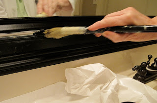 Once the wood is cut and you are ready to paint, paint the back of the trim too. You will see a little of the back from the reflection of the mirror. Just like the glue.