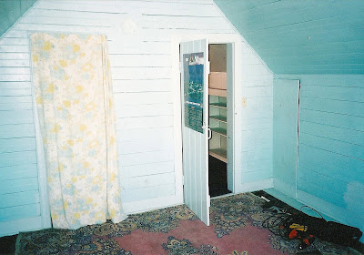 So, lets get started with the REALLY ugly pictures. Here is a view of the closet from the yellow bedroom. It is the space behind the terrycloth curtain.