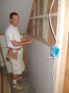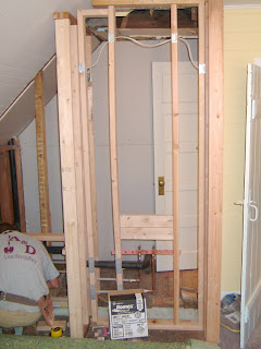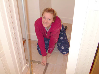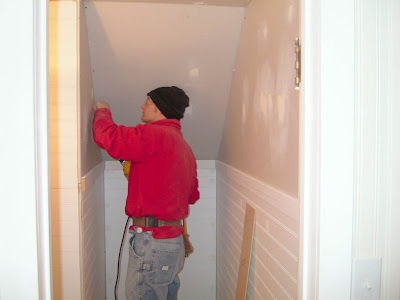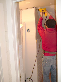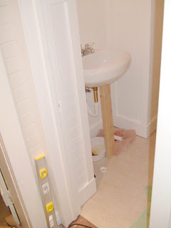 We decided that a plumber was mandatory for installation, and let me tell you, that 600.00 to install all the plumbing in less than 5 hours was more worth it than anything else we spent. We had him tie in the waste line, and bring up the water lines, all we had to do was up the sink toilet and faucet in place, which Justin has no problems with. Then we finished up the closet in the craft room.