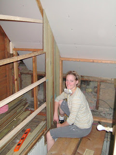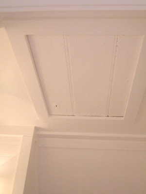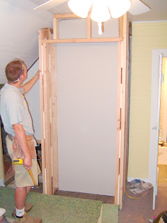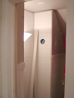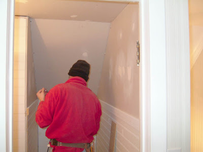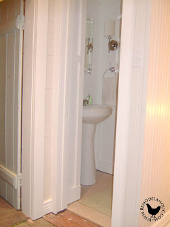 One little detail that I wanted to show you was this board (under the ladder). We found it in the hidden closet in our master bedroom, that later became the linen closet. We decided to leave an access panel to the upper attic space in the bathroom ceiling. So, we cleaned up this old piece of a door, cut it to size and used it as the access door. This was one of my favorite details in the whole house. See the little key hole? fun, fun!