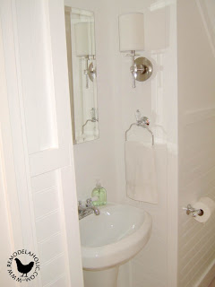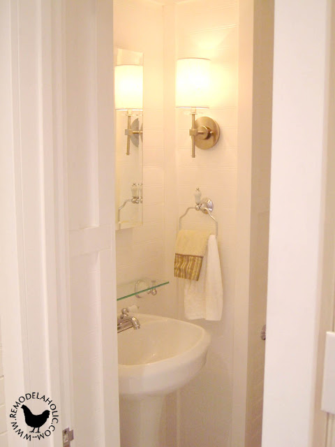 >Great job! Love the little details- the glass shelf above the sink, the globe on the light fixture, horizontal beadboard (such a refreshing change from traditional vertical placement). It's beautiful!